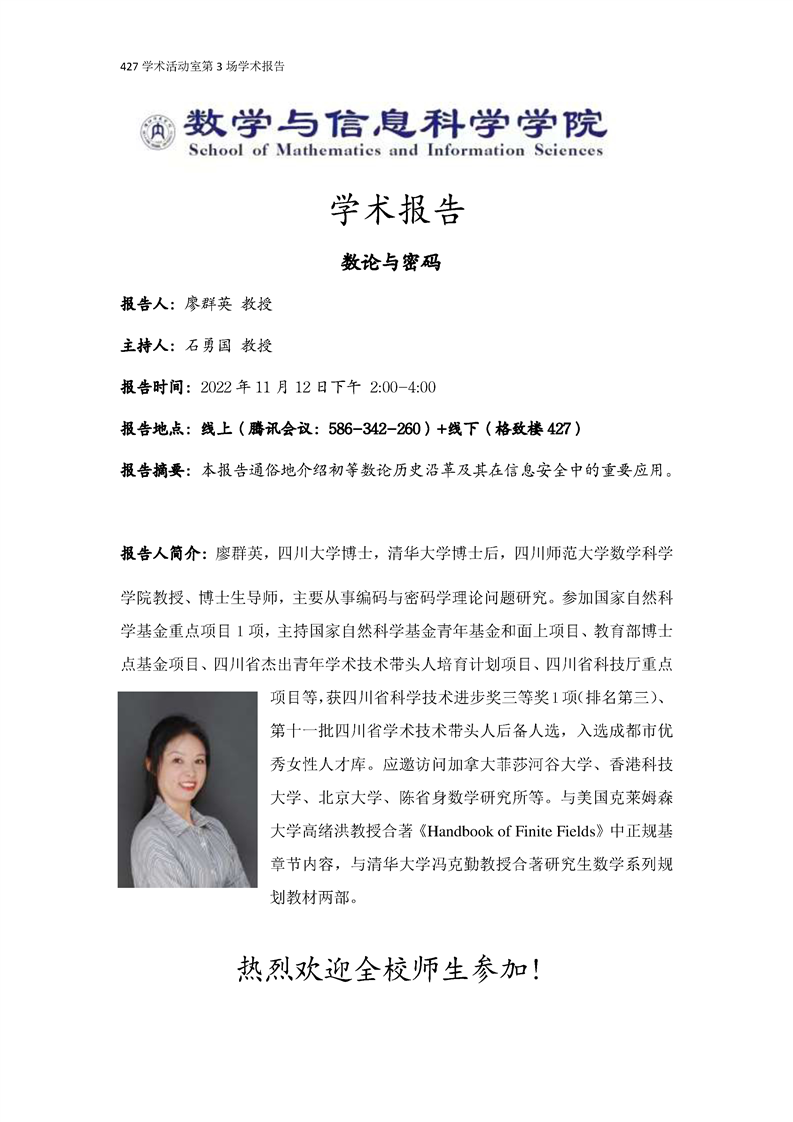 学术报告预告:11月12日 数论与密码