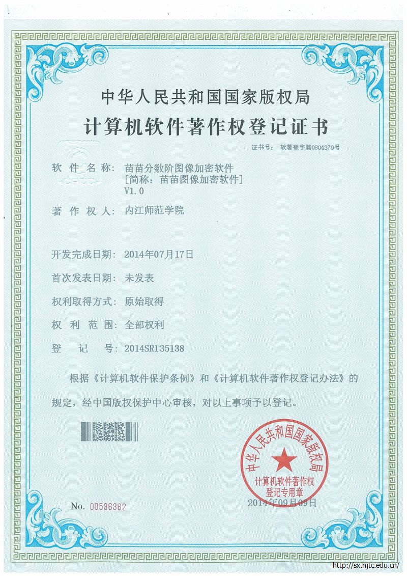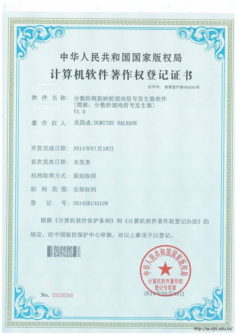 公司吴国成老师团队和土耳其Cankaya大学Dumitru Baleanu教授合作,基于离散分数阶动力学原理,研发了分数阶混沌信号发生器软件、苗苗分数阶图像增强软件、苗苗分数阶图像加密软件,获得了国家版权局登记的三项计算机软件著作权,登记号为2014SR135128、2014SR135133和2014SR135138。