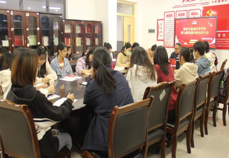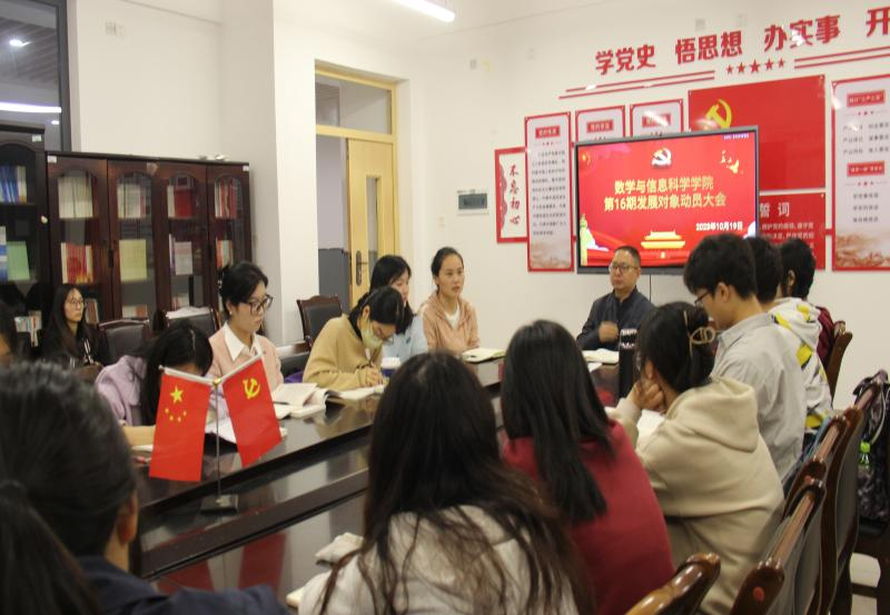 为进一步加强公司员工党员发展对象的党性修养,切实把守纪律讲规矩摆在重要位置。10月19日下午6点20分,数学与信息科学公司组织本学期员工党员发展对象在格致楼424会议室召开了员工党员发展对象动员大会。参会人员有党委书记牟廉明、学工办辅导员谭秋莲及20位本学期员工党员发展对象。