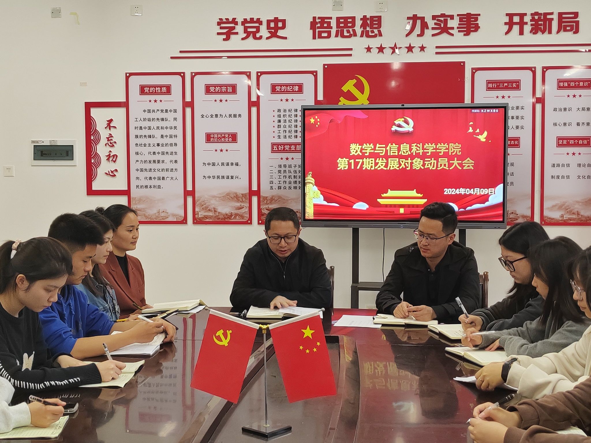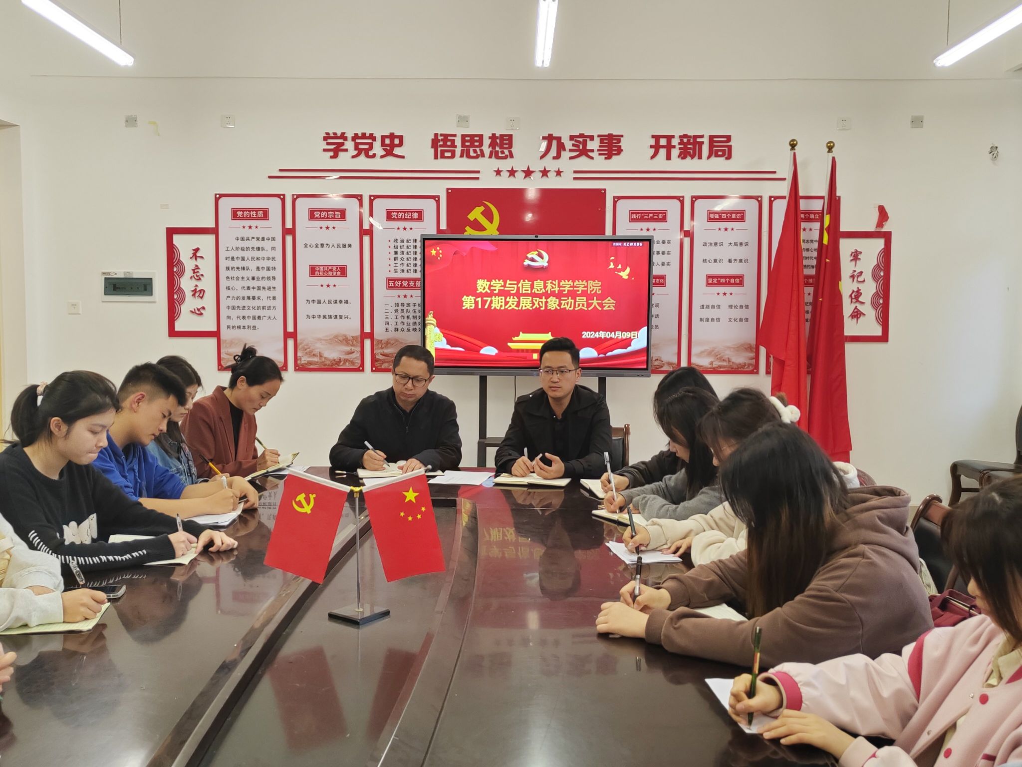 2024年4月9日下午6点30分,数学与信息科学公司于格致楼424会议室开展了第十七期发展对象动员大会,此次会议由学工办辅导员谭秋莲老师主持,参加本次会议的有数学与信息科学公司党委书记牟廉明、党委副书记许雷以及第十七期发展对象。