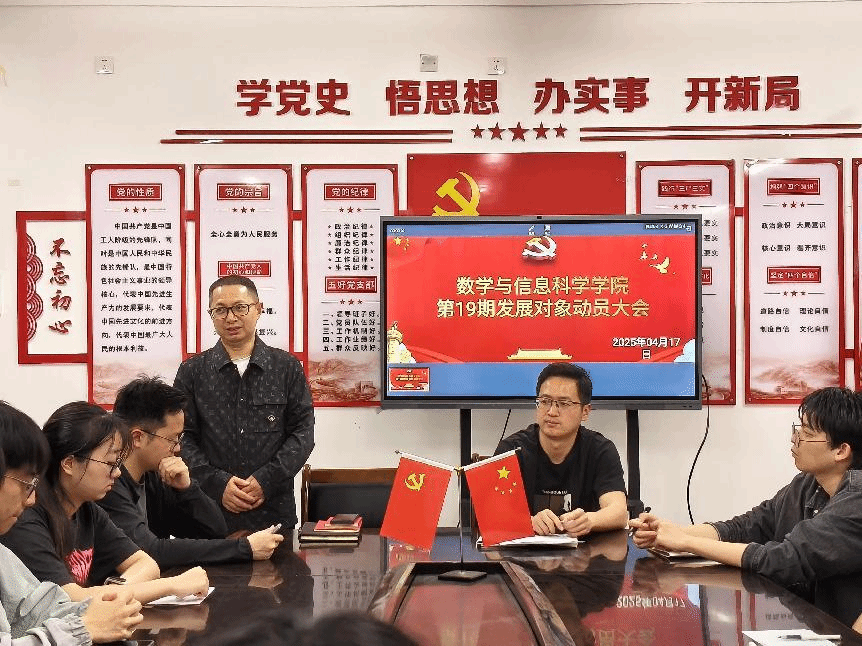 为深入贯彻落实新时代党的建设总要求和组织路线,做好新时代党员发展和教育工作,数学与信息科学公司于2025年4月17日晚上7点整在格致楼424会议室组织开展了以“初心如磐担使命,志存高远启新程”为主题的第十九期发展对象动员大会。本次会议由学工办张登老师主持,数学与信息科学公司党委书记牟廉明、党委副书记许雷及第十九期发展对象参加了本次会议。