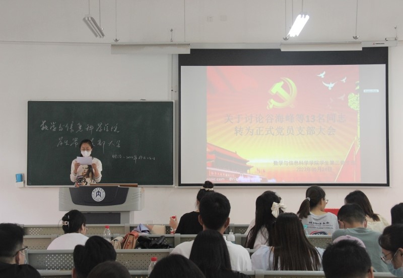 5月24日下午,数学与信息科学公司员工第一、二、三支部预备党员转正大会分别在明德楼A111教室、A312教室、A113教室召开。会议由第二党支部书记吴畏老师和支部委员会代表谭秋莲老师主持,员工支部全体党员参加了此次会议。