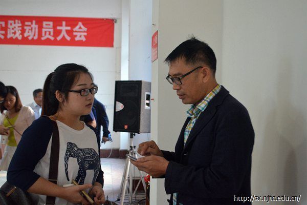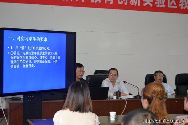 会议伊始,在资中执教30年的夏文忠老师用幽默风趣的语言向同学们传达了要在工作中寻找工作与生命的乐趣,要趁着年轻时有冲劲,不断尝试各种方法,不断与他人交流,从而做到少走弯路更快进步的思想。同时夏老师也向同学们提出,要先学习规则按部就班然后才能站稳舞台,把讲台变成舞台,实现自己伟大的目标。紧接着,教研室林中柱主任向参与教育实践的同学们提出了要用“爱”去开启员工的心灵、在实习期间要多听课与评课、经常教学反思、提高自身素质等四点要求。随后他也对实习指导老师与公司做出了一些要求,例如:以身作则,用心教化、给予实习生更多试讲和正式上台的机会等。