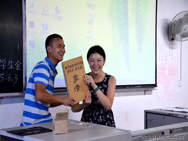 紧接着是各部门进行的工作交流。各部门代表都通过PPT展览的形式对上一届的团学的师兄师姐们表示衷心的感谢和依依不舍的情谊。其中权益部更是收集了每个成员对部长及师兄师姐要说的话,在柔和的音乐声中,一句句感人肺腑的话更是触动了在座每个人的心。最后员工会代理副主席郭小露也代表第十五届团学成员对第十四届团学成员表示感谢,感谢他们辛劳的付出,衷心希望他们能找到理想的工作,能幸福的找到另一半,她也坚信这一届团学可以做到更好。然后是传承团学家谱和发放聘书的环节,在团学成员的注视下, 第十四届团学主席林忠福将团学家谱的传给了第十五届员工会代理副主席郭小露。