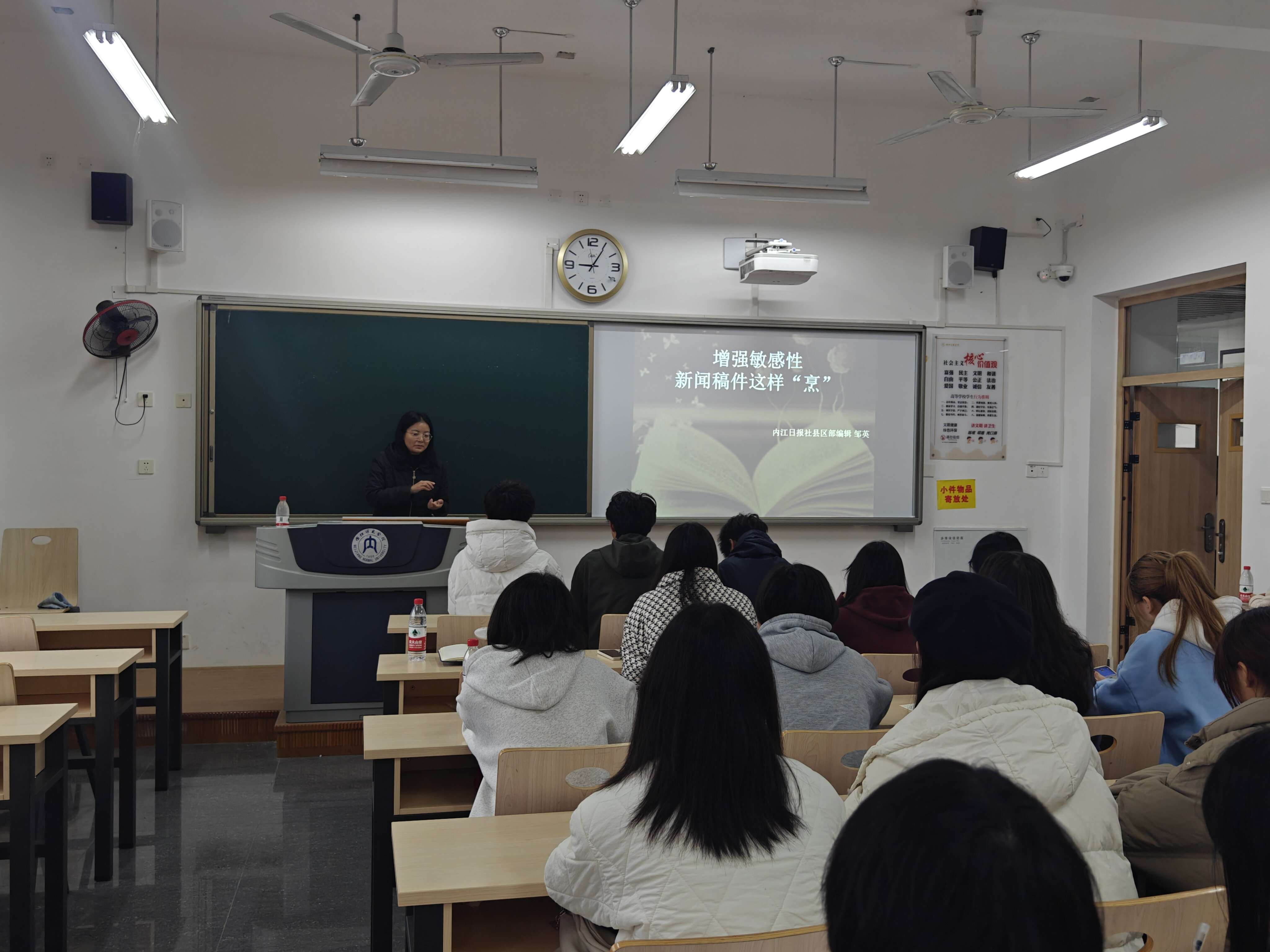 11月25日上午9点,数学与信息科学公司邀请内江日报社县区部编辑邹英老师在明德楼B118教室为公司团总支传媒中心的同学们开展主题为“增强敏感性,新闻稿件这样‘烹’”的新闻采写培训会。公司团总支副书记、学工办副主任宋秋莹、传媒中心负责人及志愿者参加此次培训会。