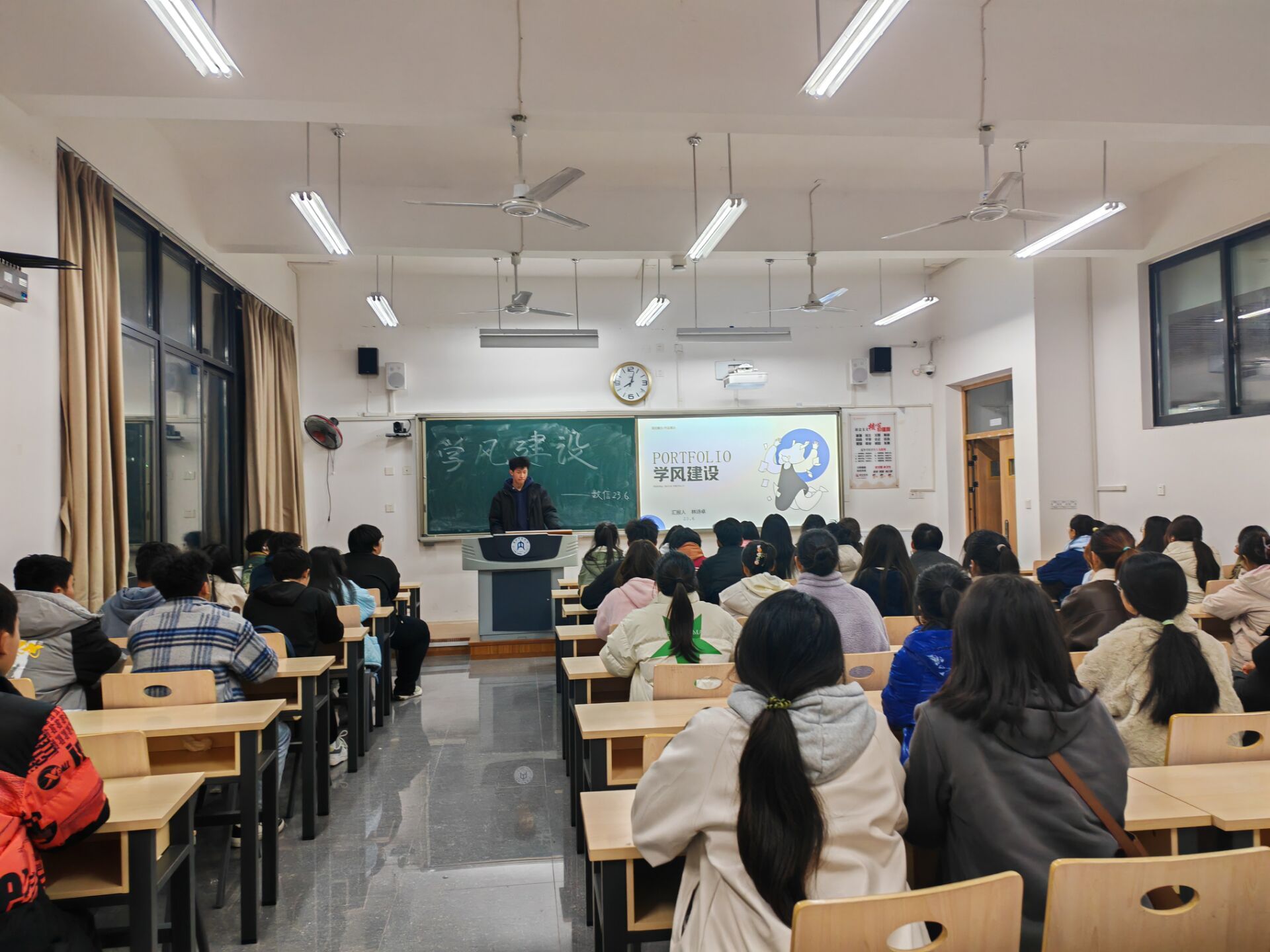 此次班会主要围绕两个内容展开,一是通过案例分析,引导同学们认识到优良学风的重要性;二是围绕“树优良学风、创先进班级”“端正学风如何从我做起”“寻找身边不良学习现象、寻求改进学风措施”等话题进行讨论,增强员工自主性、创造性学习的意识,形成“找差距、学先进、赶先进”的良好局面。在进行话题讨论的过程中,同学们积极参与,分享学习上的好经验。有的同学勇敢的指出班级在学风建设上存在的不足,并提出了有针对性的措施办法,整个班会形成了人人关心、人人参与、人人支持、人人服务学风建设的浓厚氛围。班会结束后由各班班长进行总结,概括班会主要内容及对学风建设的深刻理解。