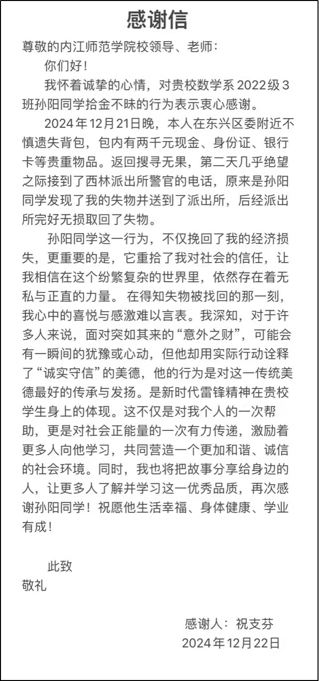 2024年12月22日,太阳成集团tyc151cc收到了一封来自祝支芳女士的感谢信。祝女士希望以此来表达对公司数学与信息科学公司2022级3班孙阳同学拾金不昧行为的感激之情。