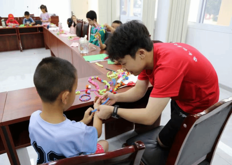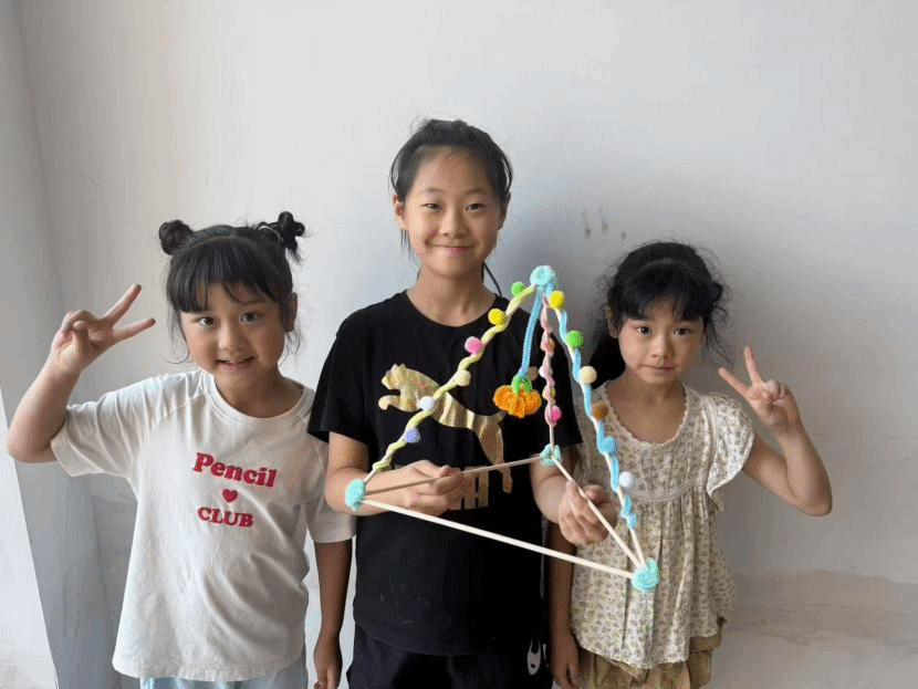 活动期间,团队每日上午在直升镇红色家园(荣升社区和燕儿村)、道观村、黄坭村、万宝村的公益托管班中,为孩子们提供作业辅导,帮助他们巩固学业知识。辅导之余,还开设拓印纸扇、黏土制作、几何模型搭建、画书签、扭扭棒制作、折纸、剪纸等手工创意课程,让孩子们在动手实践中拓展思维、提升能力,课堂上充满欢声笑语。