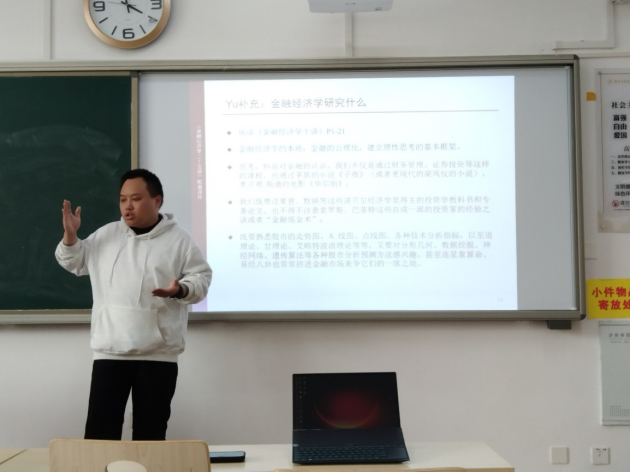 最后,金融数学教研室老师参加了喻啼鸣博士开新课《财政学》和《金融经济学》的集体备课活动。教研室各位老师就《财政学》和《金融经济学》的学习方法与教学经验进行交流,探讨要如何打造高质量课程,教研室每名老师都收获颇丰。