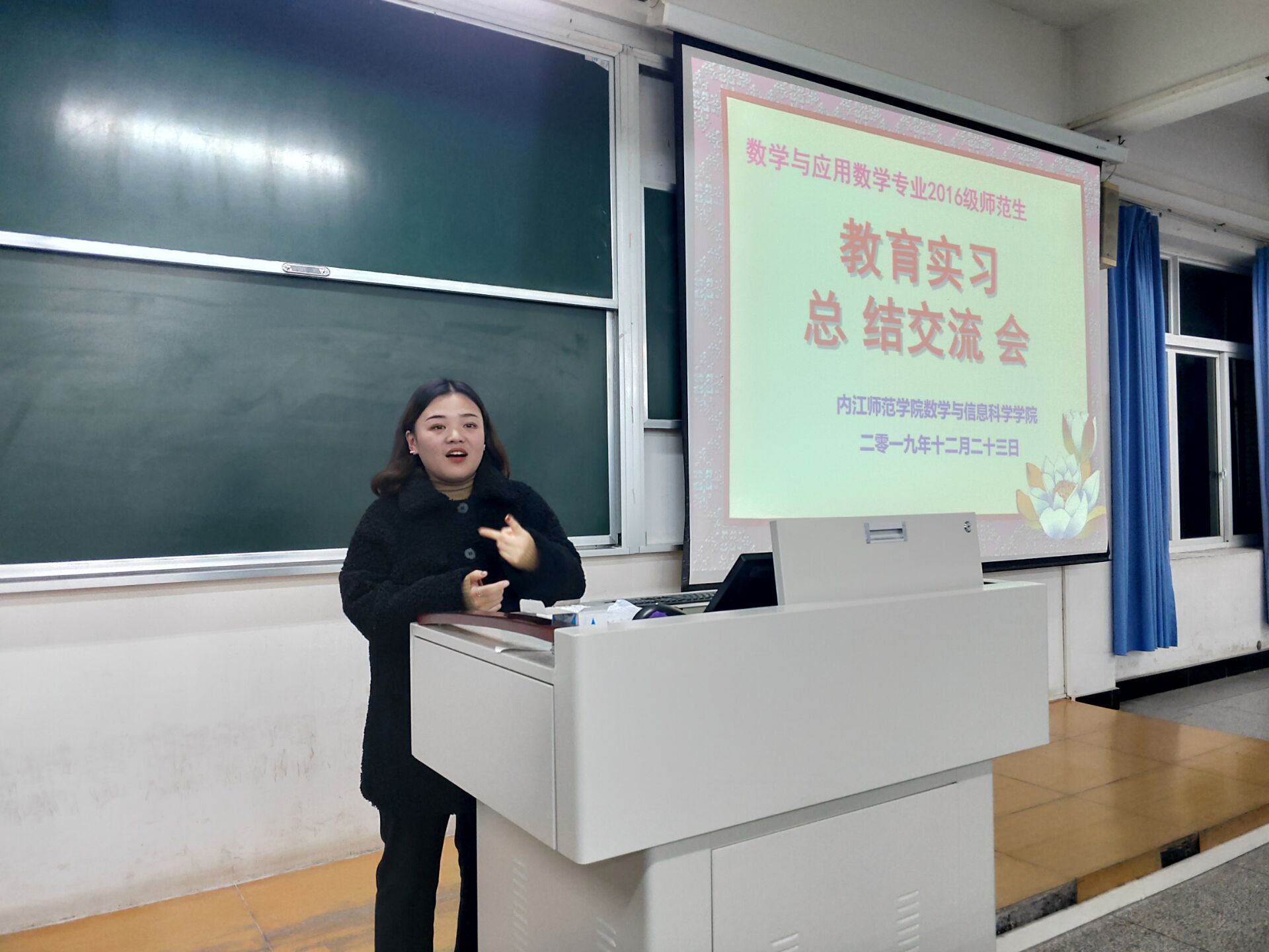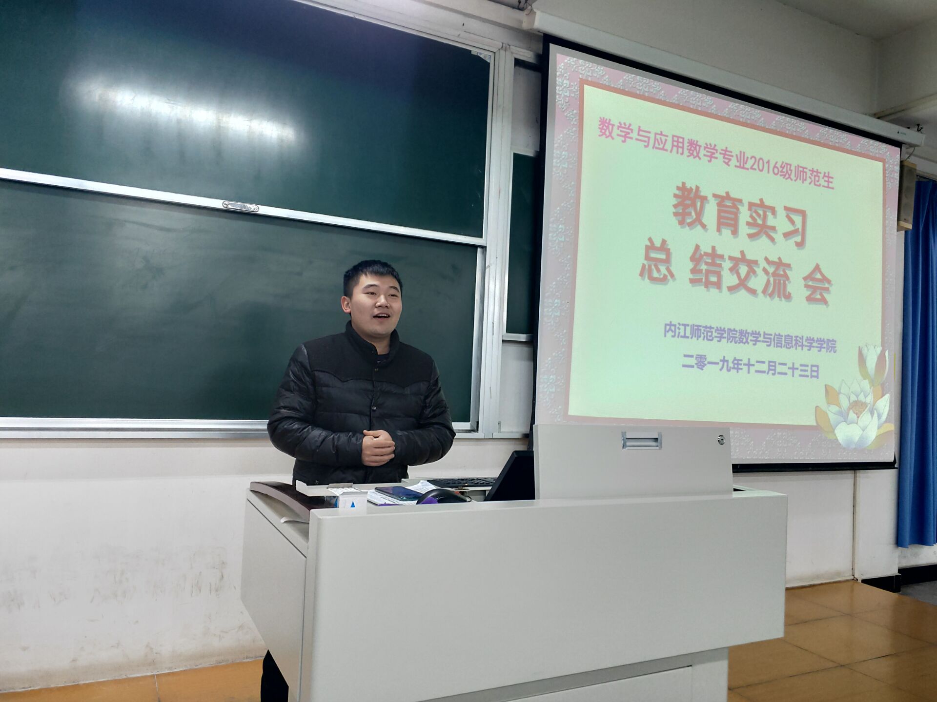2019年12月23日晚上7:00,数学与信息科学公司2016级师范生教育实习总结大会在五教南106隆重举行。参加本次总结大会的有数学与信息科学公司实践教学教研室主任吕晓亚老师、本次教育实习驻点教师王亚雄老师以及2016级全体师范生。