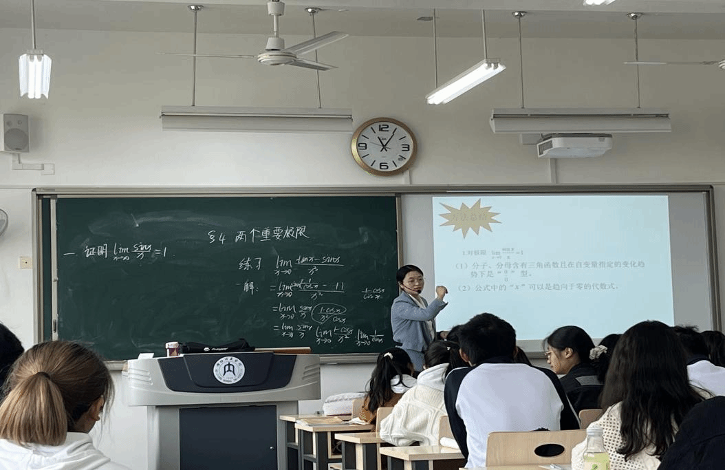 胡富雅老师的讲课内容是《两个重要极限》,首先,胡富雅老师复习上节课内容之后,用图形直观引入,引导员工猜测出重要极限,然后师生合作进行证明,最后用不同难度的习题分层次进行巩固。整个教学过程设计比较合理、重难点突出、思维严谨、教学流畅、逻辑推理清晰、课堂气氛轻松和谐。教学过程全程录像,以便教学研讨和回顾改进。