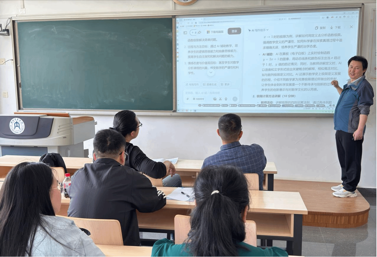 教研室主任徐家斌首先介绍了AI技术在教育领域的应用现状,并分享了四川大学"面向未来和数智赋能的学习范式、教学方式与培养模式变革研讨会"的先进经验。随后,与会教师围绕AI技术在数学教学中的具体应用展开深入讨论,并通过豆包、DeepSeek等AI工具,实时演练教案设计、课程思政元素挖掘、作业批改、试题命制、员工答疑及学习计划制定等,过程中尽管发现AI在作业批改准确性、教案适配性等方面仍需完善,但教师们一致认为,主动探索AI与教学的深度融合是推进教改的关键路径。
