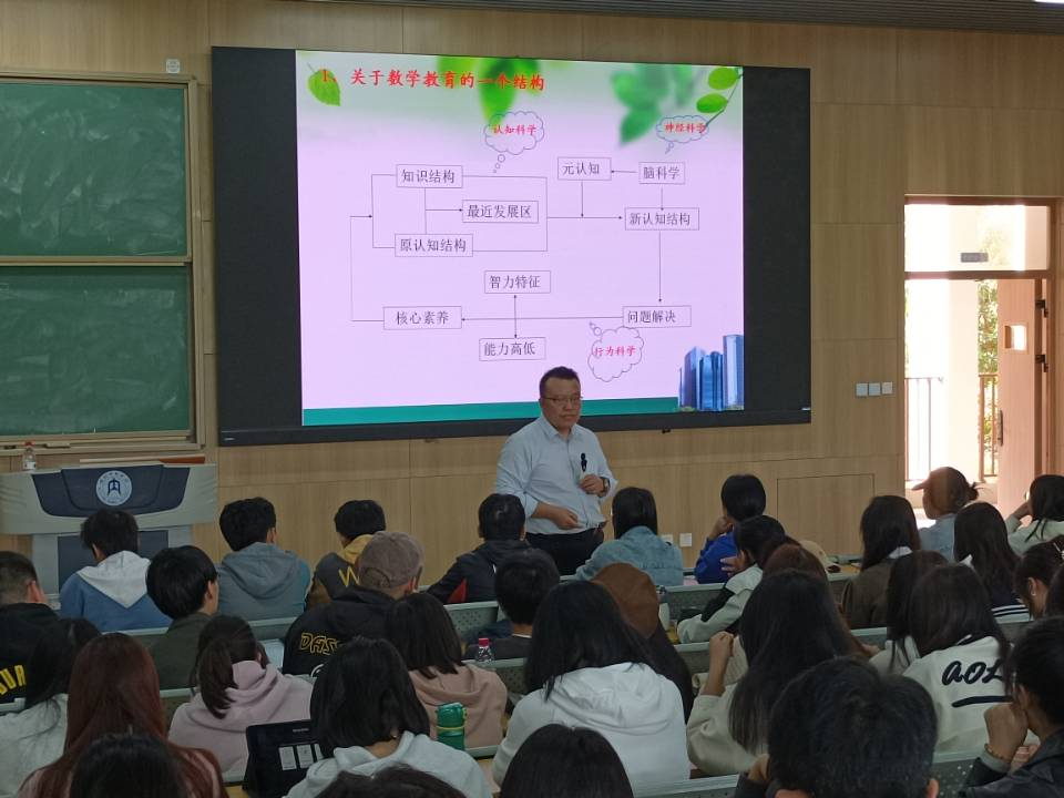 讲座伊始,柴文斌老师首先介绍了关于数学教育的一个结构,该结构包括认知科学、神经科学、行为科学,并着重强调了员工的学习主体性。其次,柴老师谈到了作为一名数学教师,应当对知识点形成元认知,从而鼓励大家在大学学习期间也应当多尝试,体验式学习将学习的知识内化。