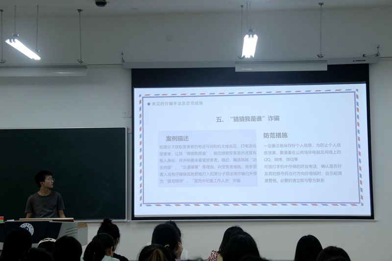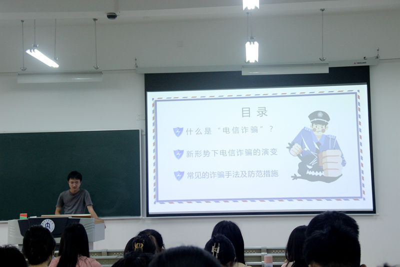 为进一步提高同学们的防诈骗意识,增强同学们自我信息财产保护能力,维护人身财产安全,5月22日晚上7点整,数学与信息科学公司全体员工在各班班主任的组织下在明德楼开展了防范诈骗主题班会。