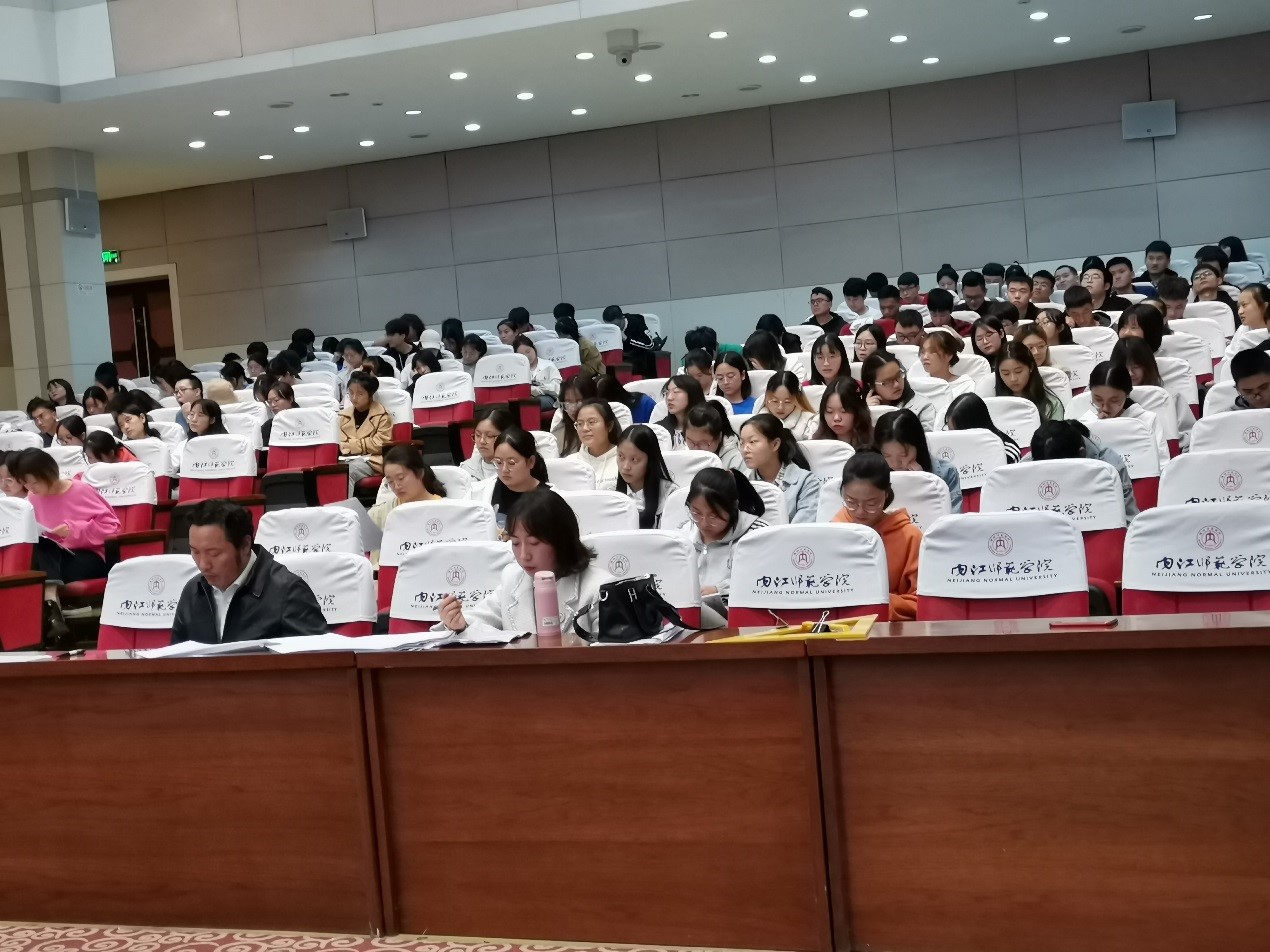压轴登场的杨周明老师,以“教师的课堂评价看点”分享一课,为同学们提供了教学设计依据和应试技巧,更加深入地点拨了同学们教学设计应该注意的问题,将自己多年的经验毫无保留地与同学们进行分享,他特别提到:“在教学过程中,一定要体现‘教师为主导,员工为主体’的理念”,并以具体实例结合讲解,让同学们深受启发。