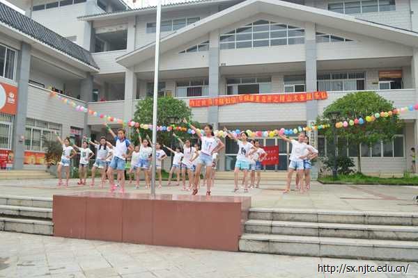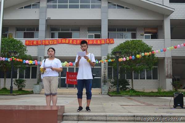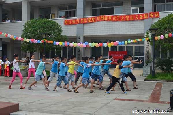 上午8点,汇报表演正式开始,志愿者们在舞台面前摆好凳子,等待领导和当地村民入座。在主持人热烈激昂的语气中,在座的观众听到了来自志愿者们最诚挚的祝福。简短的开场白之后,大家首先欣赏到的节目是志愿者们带来的舞蹈《快乐的歌》,虽然排练的时间不长,但队员们还是跳出了激情,跳出了活力。
