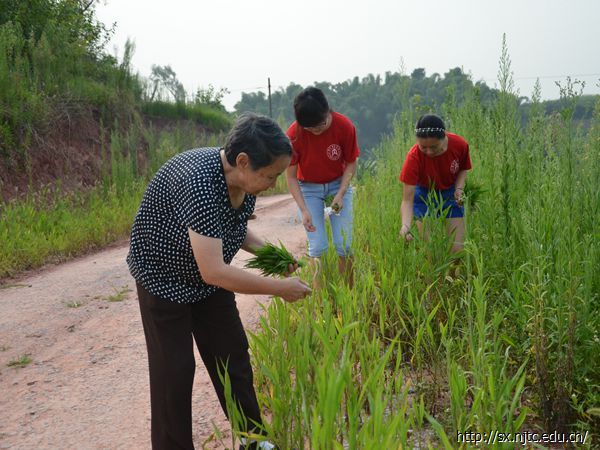 调查之余,在7月13号清晨,几位志愿者搀扶着老人散步。在散步过程中,老人们非常热情的和志愿者一起拉家常,一边散步还一边玩弄路边的狗尾巴草,志愿者一边替老人摘一边细心的学习如何将狗尾巴草编制成狗。在散步途中更令大家开心的是,在公路旁边找到一味野菜,大家兴奋的摘起野菜准备当做中午的一份菜肴。陪同老人散步结束后,部分志愿者又去到当地计生办协助简单的工作。