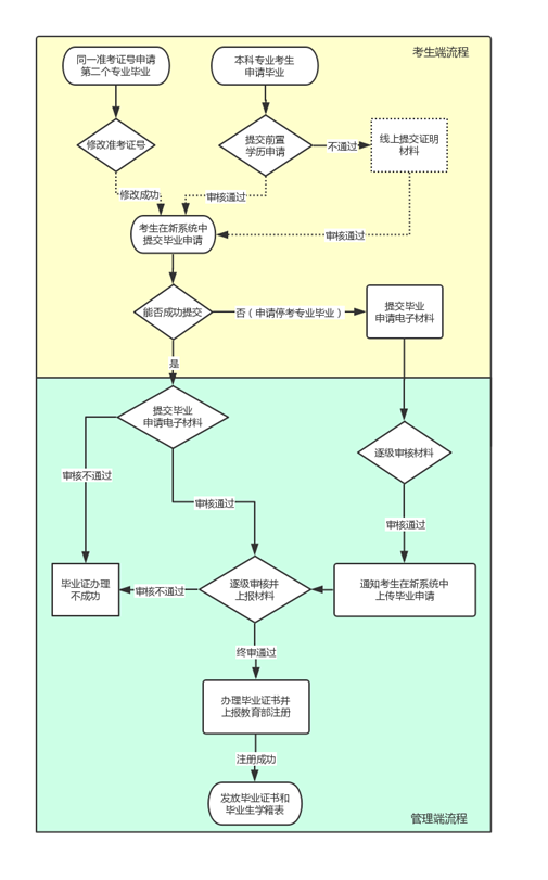 考生通过高等教育自学考试管理信息系统(以下简称管理系统)考生端(网址:https://zk.sceea.cn)提交毕业申请和缴纳毕业生审定费,并按要求提交电子申请材料。准考证注册地招生考试机构、院校自考办受理和打印考生的电子申请材料,并通过管理系统管理端(网址:https://zkk.sceea.cn)逐级审核,工作流程图详见附件2。